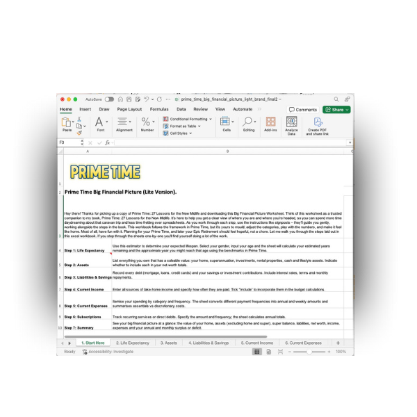 This is the spreadsheet template referred to on page 49 of Prime Time: 27 Lessons for the New Midlife to help you map your income, assets, and plans across every phase of Prime Time and into retirement.